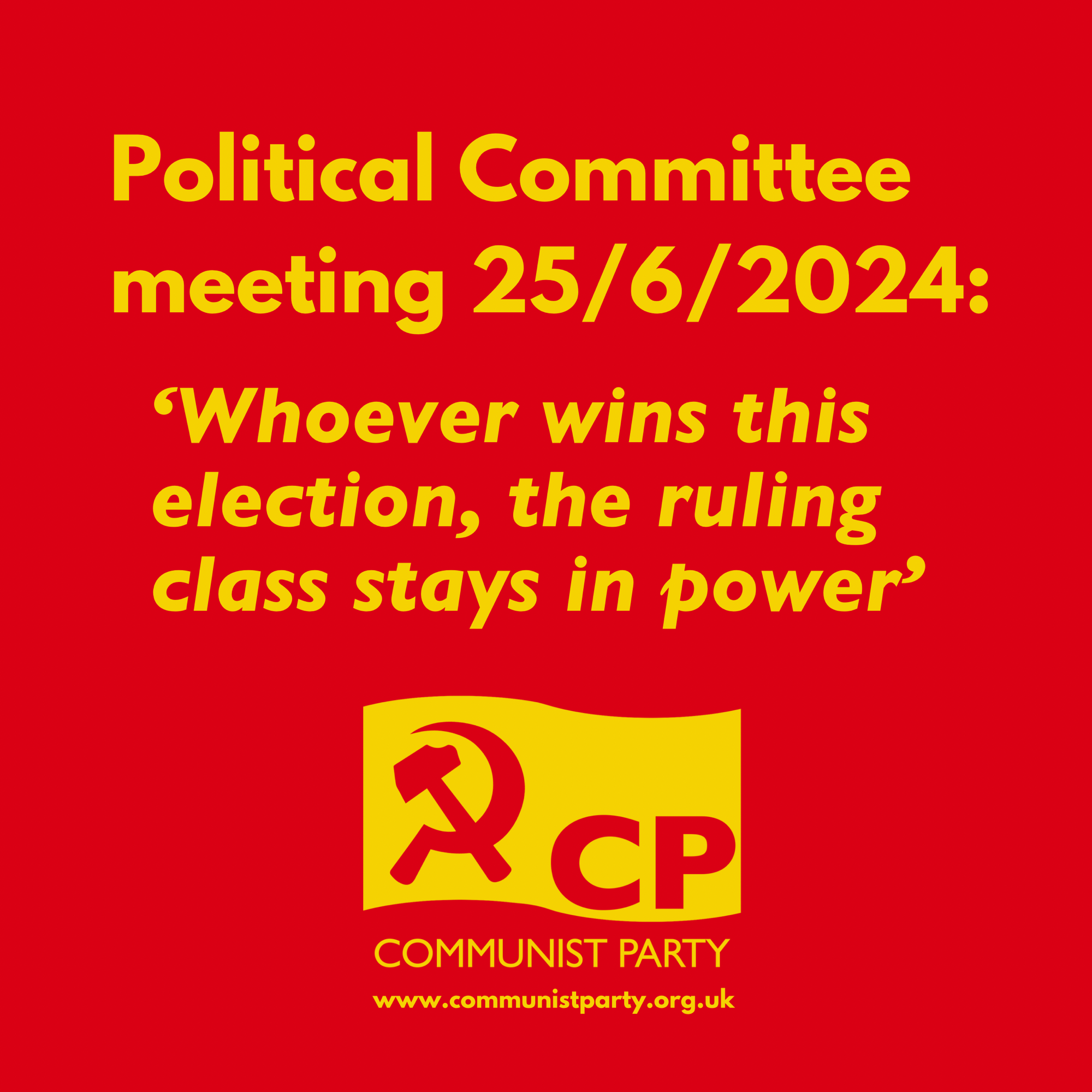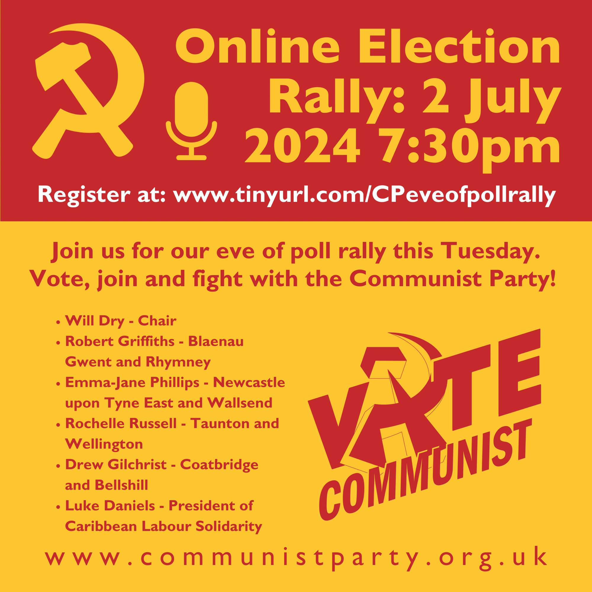 Next Thursday is our opportunity to boot the Tories out of power after 14 long years. Communist Party candidates and their teams have been hard on the campaign trail over the last 5 weeks bringing popular, socialist and anti-imperialist politics into the hearts of our communities. We have been using these campaigns to build and strengthen the Party and the YCL for the fights that lie ahead in a new period of struggle for socialist revolution. Come along to our online pre-election rally this Tuesday at 7:30pm and hear why we’re calling for working people to vote Communist and join the Party – and what happens next. Invite your friends, allies, supporters and other activists. Register at https://communistparty-org-uk.zoom.us/webinar/register/WN_Zrhdf3tvRI6dfOjRm3t2Dw#/registration Speakers include: