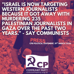 The Communist Party condemns the ‘live fire’ attack on British journalist, Steve Sweeney as “yet another war crime perpetrated by Israel’s military against media workers reporting from the front lines of Israel’s invasion of southern Lebanon.”