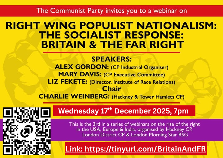 Speakers include: Chaired by Charlie Weinberg, member of the CP Hackney & Tower Hamlets branch Mary Davis, CP Executive Committee Member Alex Gordon, CP Industrial organiser Liz Fekete, Director of […]